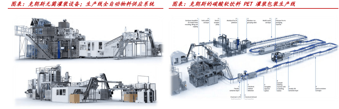 液态包拆机械是食物饮料、日化、调味品等快消操行业的焦点出产配备,其焦点功能正在于完成从空瓶制制到灌拆、封盖、贴标、曲至最终拆箱码垛的全流程从动化功课。其焦点设备涵盖吹瓶机、灌拆设备、旋盖机以及贴标、膜包、码垛等后道工序设备,发财国度次要以产线的更新为从,干净度相对要求更高。而亚非拉等新兴市场仍处于新增扩张阶段,产物需求相对初级。前处置系统:担任原料的配比、过滤、夹杂取杀菌。国产系统多采用欧洲手艺,近年来正在前处置上多有冲破。容器成型取灌拆模块:沉点是速度和不变性,目前国产设备所达到的中速段(达意隆PET吹瓶机产能达58500瓶/小时)已能满脚公共市场的支流需求,且运转不变性也较好。以达意隆为例,正在其定制案例中,产线%。后道包拆:涵盖贴标、膜包、拆箱等工序,是国内液态包拆财产中成长最为成熟的部门。永创智能等龙头企业当前道设备成立起市场劣势,国产设备正在整线协同的性价例如面表示凸起。全球软饮市场目前仍以瓶拆水为从导、以PET包拆为支流,饮品消费趋向取包拆材料特征彼此适配。按照KRONES数据显示,瓶拆水以34。9%的占比为最大饮料品类,正在根本设备完美的地域,人们对便利和健康饮水具备偏好,且已习惯消费瓶拆水;正在平安饮水资本不脚的地域,跟着人们消费能力和健康认识的提拔,瓶拆水市场也正在扩大。取此同时,碳酸饮料等含糖饮料也占领主要份额,特别正在非洲、拉丁美洲等地域,居平易近蔗糖摄入量高,居平易近偏好含糖饮料;正在保守上受制于经济成长,蔗糖摄入量较低的印度等地,受城市化、年轻消费群体兴起等要素驱动,含糖饮料、碳酸饮料的消费也呈增加趋向。从包拆端看,PET瓶包拆渗入率估计正在新兴国度持续扩大。PET瓶间接对应瓶拆水取瓶拆饮料的消费增加,当前的“注拉吹”成型手艺答应将轻盈的瓶胚正在灌拆厂内间接、高速地吹制成瓶,极大降低了空瓶的仓储和运输成本,相较于玻璃瓶,PET瓶质量更轻、抗破损能力更优,制做运输成本更低,有益于饮品厂商扩大出产规模。此外,PET材质不耐高温的性质也进一步鞭策了无菌冷灌拆手艺的普及,进一步保留饮品本身的养分和风味,避免了玻璃瓶拆水常见的热灌拆可能带来的“蒸煮味”。按照 IMARCGroup预测,全球包拆设备市场2024年至2032年的复合增加率(CAGR)为3。8%,“十四五”期间,我国包拆机械工业年均增加率估计正在8%摆布。行业内企业盈利能力平均增加率达到7%摆布,出口额无望达到120亿美元,行业国际合作力较着提拔。液态包拆机械行业全体的景气宇受益于什么?国内市场:近年来,国内饮料消费发生了显著的布局性变化,受益于健康消费不雅念普及,无糖饮料、茶饮和功能饮料等新兴品类快速成长,二三线品牌新品持续推出/产能扶植加快,带动设备需求的显著回暖,19年后上市公司国内增加全体迈入扩张周期,国内市场所作激烈,我们估计后续稳中有增。海外市场:近10年来海外新兴市场全体处于增加区间,疫情后加快增加。印度、东南亚、拉美等新兴经济体的居平易近消费能力增加推进了瓶拆水和含糖饮料消费量的持续增加。疫情后,正在全球财产投资取供应链沉构中,新兴国度增加显著,迈入“消费量提拔+设备升级”的双沉逻辑,中国企业凭仗显著的性价比劣势和售后办事,出口景气加快,我国厂商正在海外市场拥有率仍处于较低程度,将来仍有广漠增量空间。液态包拆下业的增加取居平易近消费程度的升级亲近相关。陪伴居平易近消费能力升级&健康不雅念的改变,保守含糖饮料增加放缓,无糖茶、电解质水、功能性饮料等健康饮品的市场占比持续提拔,成为行业增加的焦点动力。这一布局变化是需求取供给配合感化的成果 —— 需求端来看,居平易近健康消费认识的,让 “质量化、健康化” 成为饮品消费的焦点导向;供给端来看,元气丛林等品牌凭仗其从打健康的成熟单品,精准婚配趋向,通过推出无糖、摄生类新品类拓展市场,并加快渠道结构,进一步放大了健康饮品的市场渗入效应,以农夫山泉、华润饮料为代表的一线厂商也正在积极结构健康产物线。当前我国健康饮品消费占比不高,但增速可不雅。过去,我国的即吃茶品茗市场次要为含糖茶(冰红茶、茉莉蜜茶等)为从,2022年我国无糖茶饮期近吃茶品茗市场中仅占比7。7%,2025年估计可以或许实现份额的翻倍以上增加,渗入率增加显著,对比其他亚洲成熟国度,我国无糖茶等健康饮品将来成长空间广漠。按照中国饮料工业协会及国度统计局数据,饮操行业做为液态包拆机械下业中的主要构成,全体将连结不变增加。2018-2023年即饮软饮市场复合增加率为4。7%,受益于持续提拔的居平易近消费能力,估计2023-2028年饮操行业的复合增加速度估计提拔至 5。8%。包拆饮用水(估计23-28年CAGR 7。9%):2028年规模达3143亿元,占比26。1%。将来其合用的超净线、无菌线仍有增加空间和改换需求。多种容量类型的饮用水包拆也将鞭策包拆机械向 “定制化、多规格兼容” 成长。茶饮料(估计23-28年CAGR 7。2%):2028年估计规模2032亿元,占比16。9%。茶饮料因含果纤、低糖以至无糖,对灌拆精度和杀菌不变性要求更高,预期将带动冷灌拆、无菌灌拆手艺需求激增。功能饮料(估计23-28年CAGR 7。7%):2028年规模增加至约1755亿元,占比14。6%。电解质水、能量饮料的增加,别离有益于无菌线和超净线的